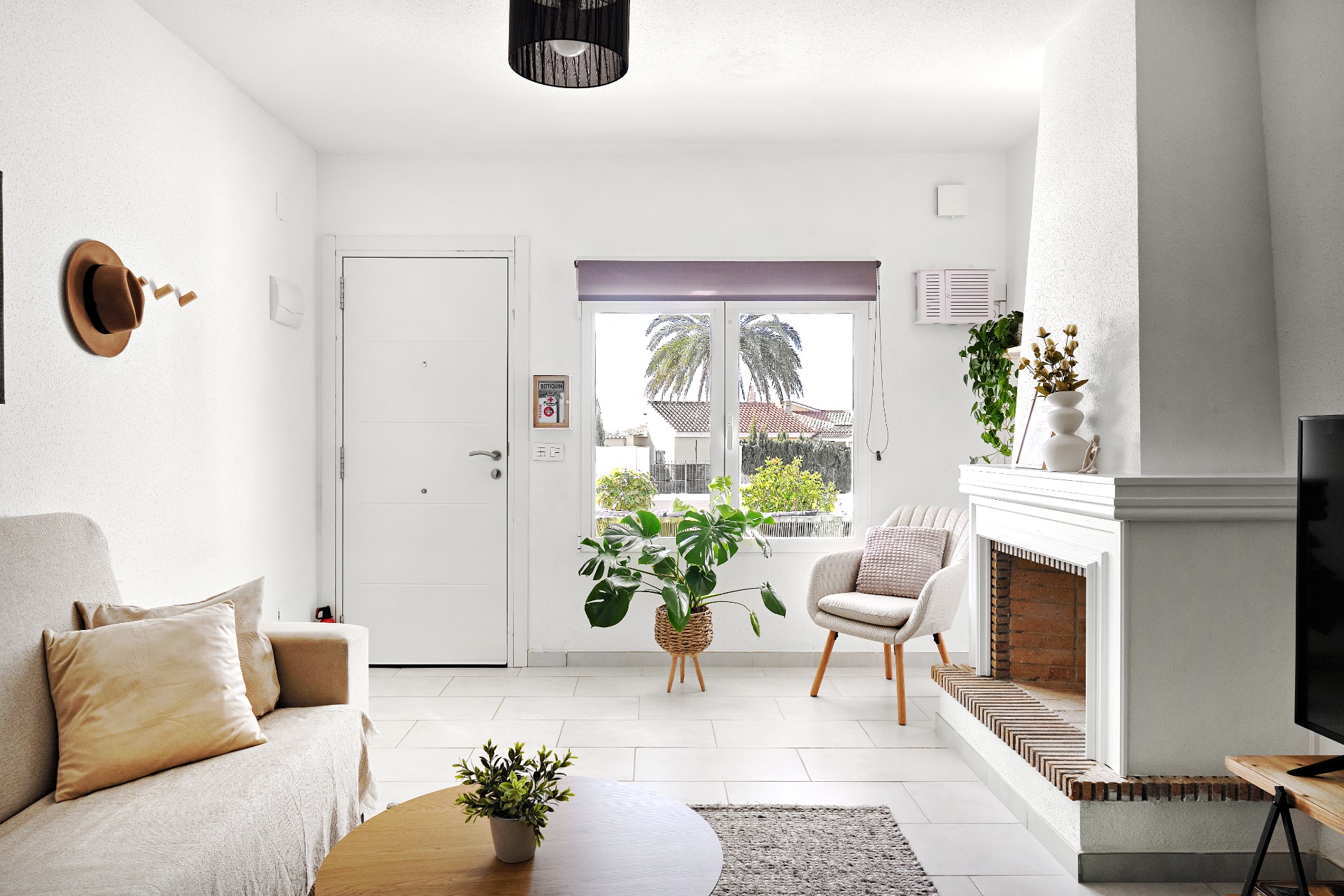 The elegant fireplace is the focal point, bringing both warmth and style to the space, while the soft sofa with cushions offers comfort for watching TV or unwinding in the evening with a good book. Natural materials, subtle decor, and thoughtful details enhance the cozy and harmonious ambiance.